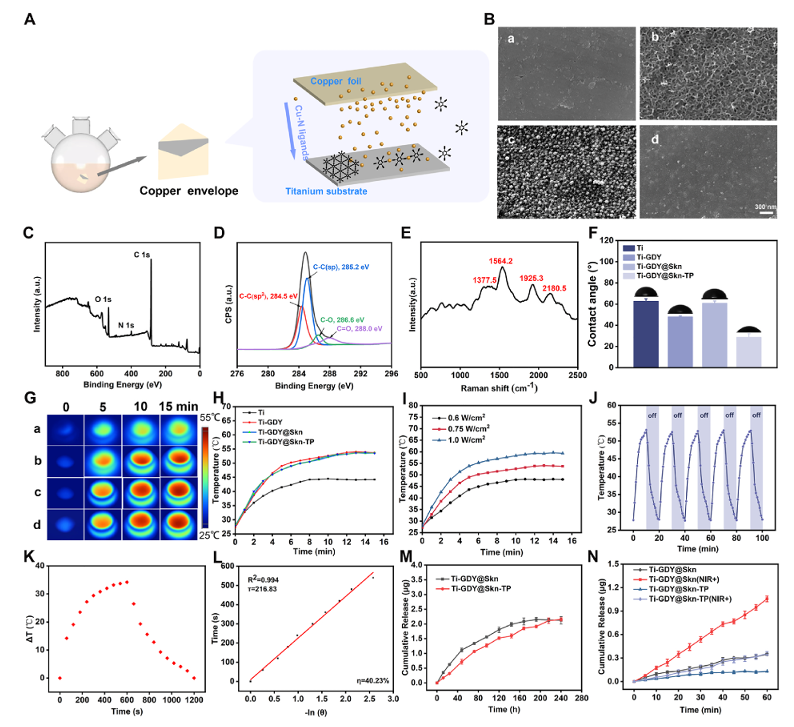 多孔GDY纳米膜的表征。(A)通过铜包膜催化在Ti衬底上合成多孔GDY纳米膜的示意图。(B) a) Ti, B) Ti- gdy, c) Ti-GDY@Skn, d) Ti-GDY@Skn-TP的表面形貌。(C) Ti-GDY的XPS宽扫描谱和(D) c1s核能级谱。(E) Ti衬底上GDY纳米膜的拉曼光谱。(F)不同样品的wca。(G)近红外辐射(0.75 W cm2)下a) Ti,b) Ti- gdy, c) Ti-GDY@Skn, d) Ti-GDY@Skn-TP的实时红外热像图和(H)光热加热曲线。(1)不同近红外功率密度下Ti-GDY的光热加热曲线。(J) Ti-GDY在5个开/关近红外辐照周期(0.75 W cm2)下的光热稳定性。(K) GDY水溶液在nirr辐射10min后激光关闭的光热响应。(L) (K)冷却阶段温度驱动力的负自然对数与时间的关系图。(M) Ti-GDY@Skn和Ti-GDY@Skn-TP网站10天内Skn的累积释放量。(N) Ti-GDY@Skn和Ti-GDY@Skn-TPunder近红外照射1小时内Skn的累积释放量。