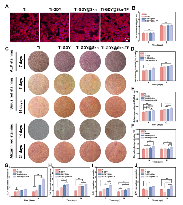 一篇发表于《Bioactive Materials》的研究开发了一种基于多孔石墨炔(GDY)纳米薄膜的多功能钛基植入体涂层系统(Ti-GDY@Skn-TP),旨在解决钛植入体面临的细菌感染、炎症反应及骨整合不足等临床难题。研究团队通过铜催化聚合反应在钛表面构建了均匀多孔的GDY纳米薄膜,利用其优异的光热转换性能,在近红外光照射下实现局部高温杀菌。同时,将天然活性分子紫草素(Skn)负载于GDY孔结构中,并覆盖一层由单宁酸(TA)和温敏性聚合物pNIPAM组成的复合涂层,实现对Skn的控释。该涂层在NIR触发下可加速Skn释放,协同GDY的光热效应,显著杀灭金黄色葡萄球菌和大肠杆菌。