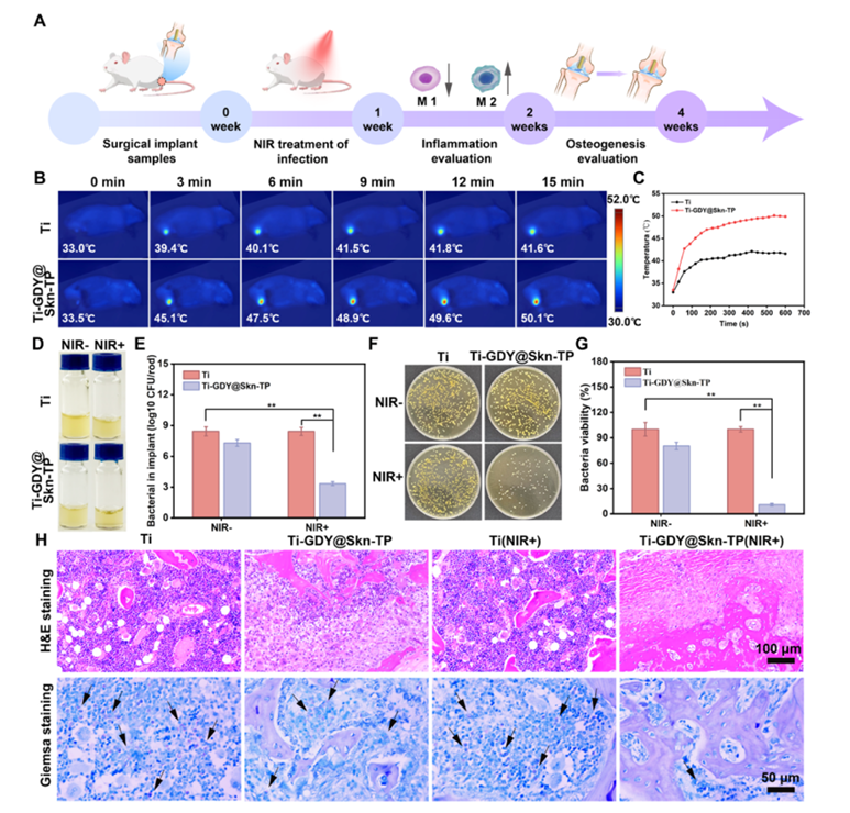不同种植体的体内抗菌性能。(A)大鼠股缺损感染模型示意图。(B)近红外辐照下Ti和Ti-GDY@Skn-TP植入物的实时红外热像和(C)温度变化曲线。(D)从种植体表面提取的含细菌的TSB培养基的浊度。(E)植入物表面金黄色葡萄球菌菌落残留定量。(F)从周围骨组织中恢复的金黄色葡萄球菌菌落的代表性图像。(G)计算各组细菌存活率。(H)种植体周围软组织的H&E和Giemsa染色显示炎症细胞浸润和细菌存在。误差条表示n = 4时的平均值±SD, **p < 0.01