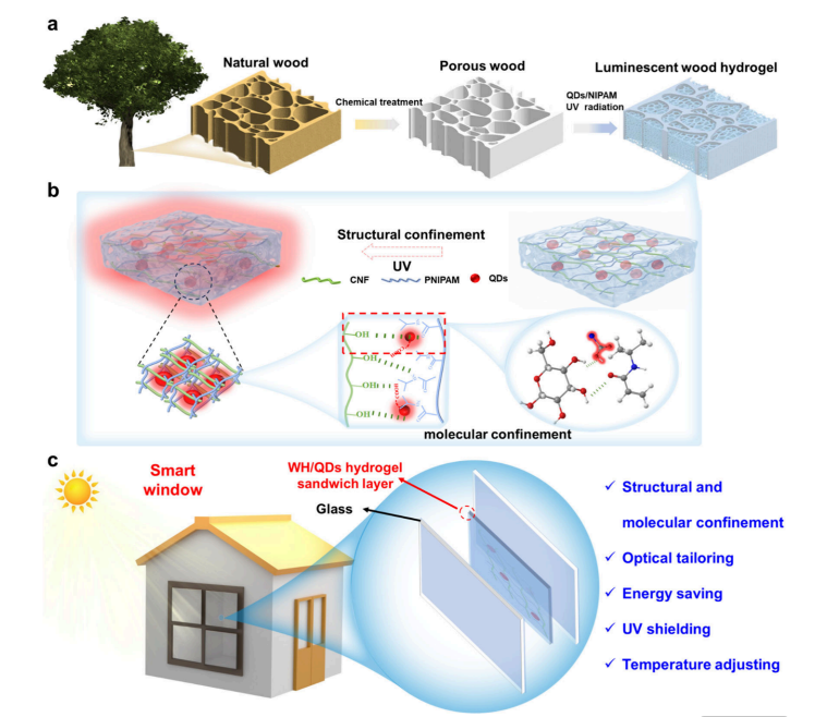 发光木材水凝胶的示意图与微观结构。(a) 发光木材基水凝胶的制备流程示意图。(b) 发光木材基水凝胶的结构与分子约束示意图。(c) 以发光木材基水凝胶作为夹层的智能窗潜在应用。该智能窗的优势突出体现在光学/温度调控、节能降耗、紫外线屏蔽以及结构/分子约束等方面。