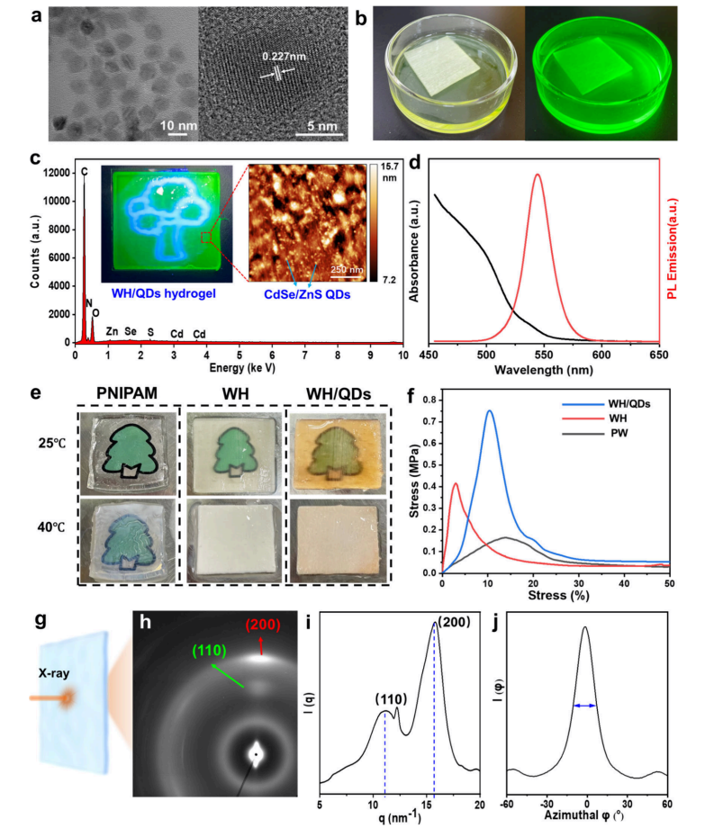WH/QDs水凝胶的光学与机械性能。(a) 硒化镉/硫化锌量子点颗粒的TEM图像。(b) 各向同性散射PW/QDs在可见光和紫外光下的照片。(c) WH/QDs水凝胶的 EDX 光谱及插图照片。AFM图像显示硒化镉/硫化锌量子点嵌入WH/QDs水凝胶骨架中。(d) WH/QDs水凝胶的光吸收光谱与光致发光光谱。(e) 纯 PNIPAM 、WH及WH/QDs在25℃和40℃时的热响应行为。(f) PW、WH及WH/QDs水凝胶的拉伸应力-应变曲线。(g) X射线同步辐射束垂直于WH/QDs表面的示意图。(h) WH/QDs水凝胶的广角X射线衍射散射(WAXS)衍射图。(i) 图h所示衍射图的径向积分。(j) 图h所示衍射图(200)散射平面的方位积分。