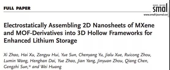 最近,南京工业大学孙庚志教授课题组在国际知名学术期刊Small上发表一篇题目为:Electrostatically Assembling 2D Nanosheets of MXene and MOF-Derivatives into 3D Hollow Frameworks for Enhanced Lithium Storage的研究论文,该研究通过简单可控的方式,将负电性的2D MXene纳米片与由ZIF-67衍生的正电性的层状双金属氢氧化物,通过静电自组装的方式复合在3D的空心结构中。经过退火处理,过渡金属氧化物@MXene (CoO/CoMo3O8@MXene)复合空心电极应用于锂离子电池中,CoO/CoMo3O8纳米片可以阻止MXene的重堆积并提供超高的储锂性能。同时,MXene纳米片可以形成3D的导电网络并具有机械稳定性,进而促进在界面中进行快速的电子转移,以及限制内部的CoO/CoMo3O8的体积膨胀。这种空心结构提供了947.4 mAh g-1的可逆容量,卓越的倍率性能以及良好的循环稳定性。
