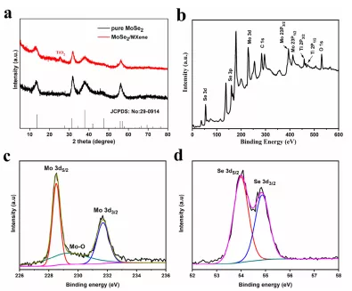 图3. a)MoSe2 / MXene异质结和MoSe2的XRD图;MoSe2 / MXene异质结的b)XPS图谱 c)Mo 3d和d)Se 3d 的高分辨率测量光谱