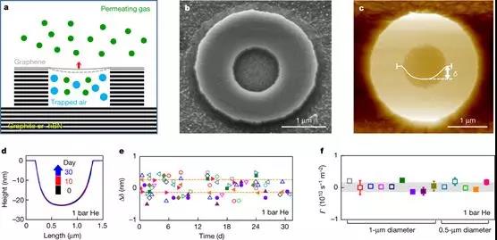 以机械剥离的石墨烯为例,在氧化硅晶圆上刻蚀的微米级孔,并用石墨烯密封,以研究气体的透过性。结果表明,没有发现任何气体透过的现象,检测灵敏度达到105-106个原子/秒