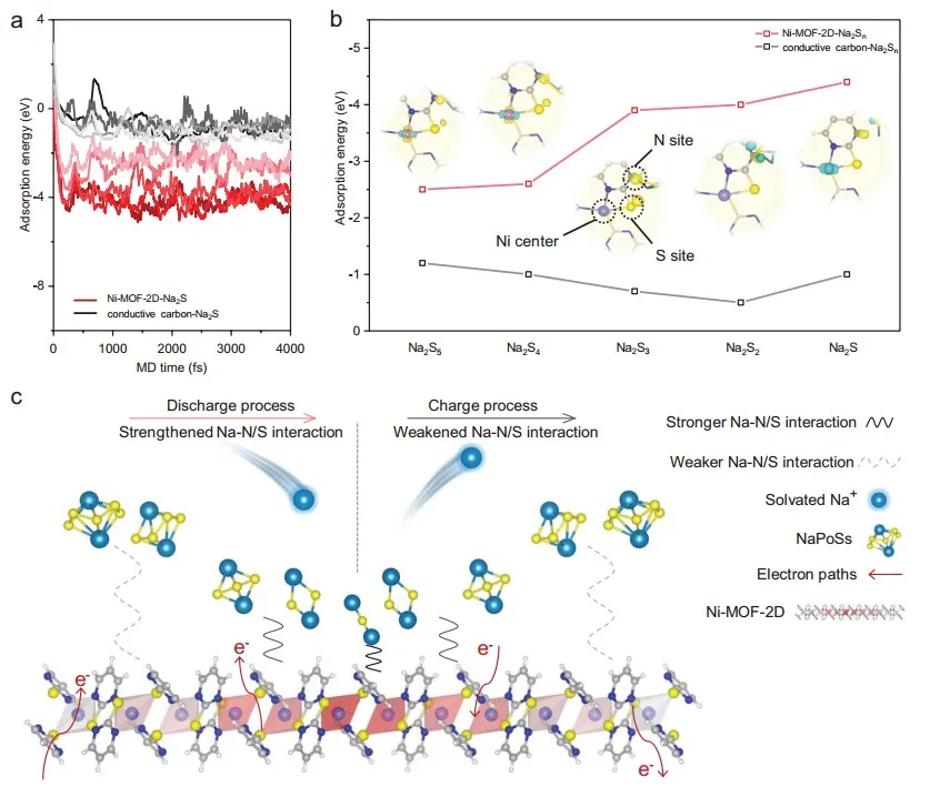 图5. 多硫化物在Ni-MOF-2D上限域的理论计算研究。(a)从头算分子动力学模拟的Na2Sn在石墨烯和Ni-MOF-2D上吸附能和时间关系;(b)不同放电深度多硫化物在石墨烯和Ni-MOF-2D上的吸附能,插图为差分电荷分析;(c) Ni-MOF-2D限域多硫化物原理图。