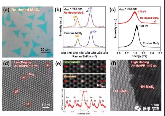 图3. 单层Re掺杂MoS2。(a)单层Re掺杂MoS2薄片的光学图像。(b)使用488 nm激光获得的原始和Re掺杂MoS2的拉曼光谱(归一化为A‘1模式)。(c)Re掺杂MoS2和原始MoS2单层的PL光谱。(d)用AHM:APR 1:1 wt(低掺杂)合成的单层Re掺杂MoS2的原子分辨STEM-HAADF图像。(e)ReMo掺杂剂的实验和模拟STEM图像以及线扫描。(f)以AHM:APR 1:10 wt(高掺杂)合成的单层Re掺杂MoS2的原子分辨STEM-HAADF图像。有趣的是,Re掺杂前驱体的数量增加导致局部区域中1T‘-ReS2和1H-MoS2之间形成异质界面。