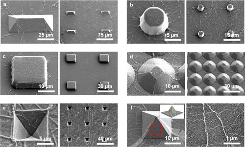 | 演示3D集成的多功能性。(ae)SEM图像显示了石墨烯整合到(a)长金字塔,(b)圆形柱,(c)矩形柱,(d)圆顶和(e)反金字塔上的结果。(f)集成在金字塔基底上的AuNPs /石墨烯杂化结构的SEM图像。右面板显示了左侧红色虚线正方形的放大图像,表明金字塔的墙壁上存在AuNP。(经美国化学学会许可转载)(点击图片放大) | |