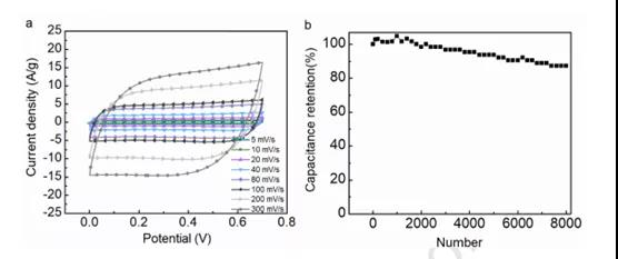 图5. 使用1 M KOH作为电解质的三电极装置中的无粘合剂电极的电化学特性