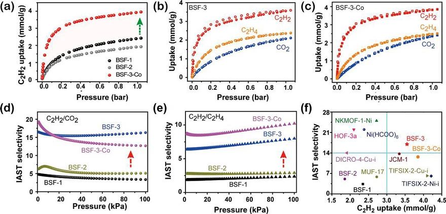 图4. (a) BSF-1、BSF-2和BSF-3在298 K下的乙炔吸附等温线;(b,c) BSF-3和BSF-3-Co在298 K下的C2H2、CO2和C2H4的吸附等温线;(d, e) BSF-3和BSF-3-Co的C2H2/CO2和C2H2/C2H4的IAST分离选择性;(f) 代表性材料的C2H2/CO2的分离性能的比较。