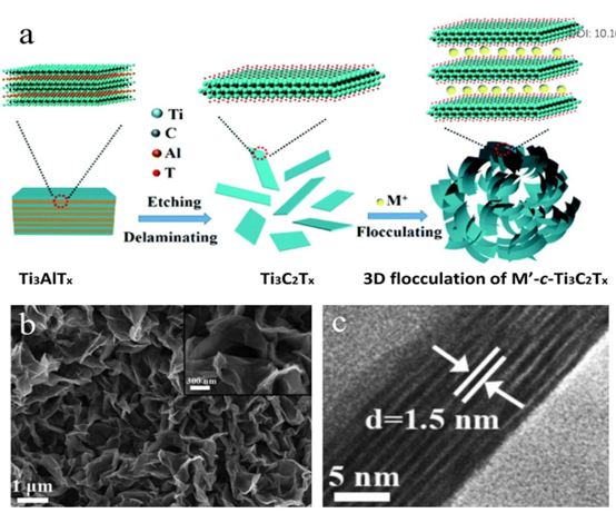 图5. (a)通过絮凝方法(Li+,Na+,K+和TBA+)合成M‘-c-Ti3C2TxMXene,(b)具有高分辨率FESEM图像的Na+-c-Ti3C2Tx的FESEM图像和(c)HRTEM Na+-c-Ti3C2Tx的图像