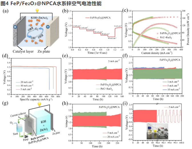 (a)基于FeP/Fe2O3@NPCA空气阴极水系可充电锌空气电池示意图。(b)不同电流密度下的恒电流放电曲线。(c)充放电极化曲线和相应的功率密度曲线。(d)不同电流密度下的恒电流放电测试,比容量由消耗锌阳极的质量标准化。(e)在5 mA cm-2电流密度下,FeP/Fe2O3@NPCA基和Pt/C+RuO2基ZAB充放电曲线。(f)FeP/Fe2O3@NPCA基ZAB在1,5,10 mA cm-2电流密度下循环充放电曲线。(g)基于FeP/Fe2O3@NPCA流动型锌空气电池示意图。h) 在5,20 mA cm-2电流密度下,粉末状FeP/Fe2O3@NPCA基流动型ZAB充放电曲线。i) 在5 mA cm-2电流密度下,块状FeP/Fe2O3@NPCA基流动型ZAB充放电曲线.图5 FeP/Fe2O3@NPCA固态锌-空气电池性能