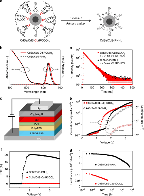 2. Nature Communications 电化学稳定的配体弥合了量子点的光致发光-电致发光间隙胶体量子点是用于量子点发光二极管中很有前途的发射器。尽管目前已经合成了具有高效、稳定和高色纯度的光致发光的量子点,但是由于装置中的不平衡电荷注入和/或界面激子猝灭,使得在发光二极管中继承其优异的发光性能具有一定的挑战。浙江大学彭笑刚教授课题组报道了具有各种外壳和表面配体组合的核/壳量子点,并开发了一种将电化学惰性配体应用于具有出色发光特性的量子点的策略,以弥合它们的光致发光-电致发光间隙。这种材料设计原理通常用于提高电致发光效率和发光二极管的寿命,从而使红色发光二极管(在1000 cd m-2处,T95 > 3800 h)以及发射蓝光的发光二极管(在100 cd m-2处T50 > 10000 h)都达到了史无前例的工作寿命。该项研究为量子点在光电和电子器件中的应用提供了重要的指导。[2]相关研究以“Electrochemically-stable ligands bridge the photoluminescence-electroluminescence gap of quantum dots”为题,发表在Nature Communications上。图二:CdSe/CdS-Cd(RCOO)2和CdSe/CdS-RNH2 QD的PL和EL特性表征图