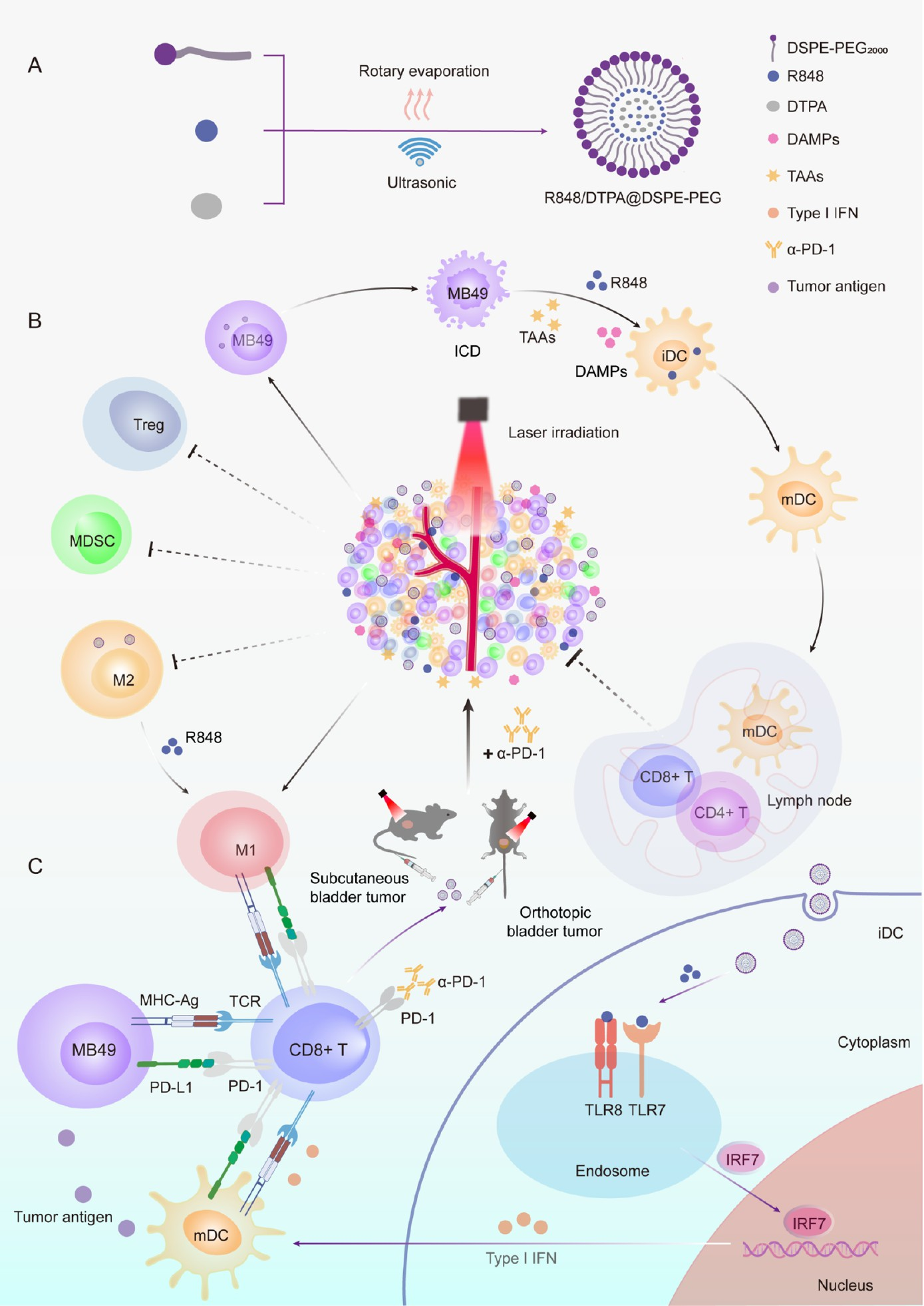 本研究报道了一种新型热敏性R848负载脂质纳米颗粒(R848/DTPA@DSPE-PEG NPs),旨在通过光热-免疫联合疗法增强膀胱癌的治疗效果。膀胱癌作为一种高发病率、高复发率和高死亡率的泌尿系统恶性肿瘤,传统免疫检查点抑制剂治疗虽有一定成效,但其应答率较低,易受肿瘤免疫抑制微环境的限制。该研究通过合成兼具光热转换能力与免疫佐剂功能的纳米颗粒,有效克服了单一疗法的局限性,为膀胱癌免疫治疗提供了创新策略。