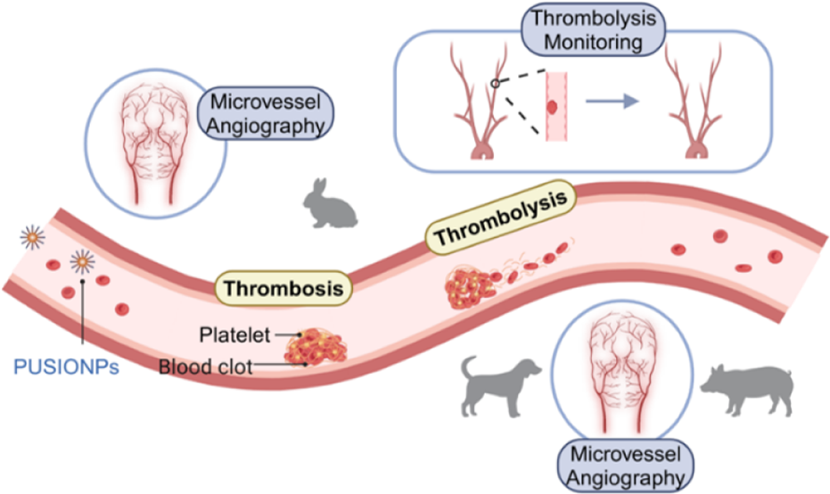 更重要的是,研究成功构建了兔颈动脉血栓模型,并利用PUSIONPs实现了长达4小时的血栓溶解过程实时监测。传统对比剂由于代谢快,需要多次注射才能评估溶栓效果,不仅增加患者经济和身体负担,也因对比剂外渗导致背景信号增高,影响血管与周围组织的区分。而PUSIONPs凭借其约9纳米的尺寸,不易穿过血管间隙,加之较长的血液半衰期,单次注射即可提供持续、清晰的血池对比,准确反映管腔狭窄率的动态变化,为临床溶栓治疗提供了理想的实时影像学监控窗口。