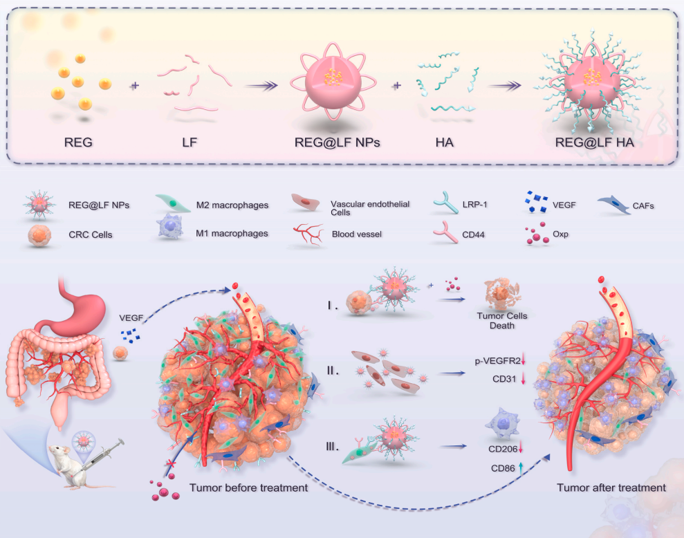 为突破这一瓶颈,四川大学华西医院钱志勇教授团队在《生物活性材料》上提出了一项创新性解决方案:他们成功构建了一种基于乳铁蛋白(LF)和透明质酸(HA)的LRP-1/CD44双受体靶向纳米递送系统(REG@LFHA NPs)。该系统的设计灵感源于对结肠癌腹膜转移(PM-CRC)肿瘤微环境的深入洞察:肿瘤细胞、癌症相关成纤维细胞(CAFs)及促肿瘤的M2型肿瘤相关巨噬细胞(TAMs)均高表达低密度脂蛋白受体相关蛋白-1(LRP-1),而CD44受体则在肿瘤细胞、癌症干细胞及多种基质细胞上广泛过表达。研究者利用纳米沉淀与静电自组装技术,将LF(LRP-1的高亲和力配体)作为药物负载核心,并在其表面包裹HA(CD44的天然配体),从而构建出能够同时利用这两条通路实现主动靶向的智能纳米平台。