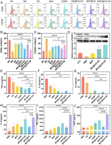 创新性地将CGRP与MnP共价连接,形成兼具神经免疫调节与ROS清除功能的双效分子(MC),从分子层面实现功能整合。MnP不仅清除ROS,还通过上调巨噬细胞膜上的CGRP共受体RAMP-1,增强CGRP的免疫调节效能,形成“清除ROS-增强神经信号-促进修复”的良性循环。
