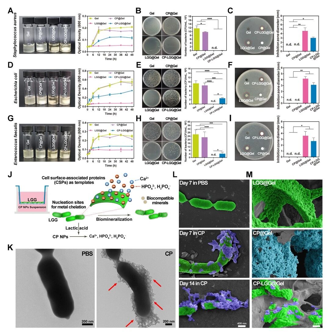 活性生物治疗水凝胶的抗菌能力和益生菌促进生物矿化。(A)金黄色葡萄球菌、(D)大肠杆菌和(G)粪肠杆菌混悬液与水凝胶共培养48 h后的代表性照片和相应的光密度(OD)值。cfu的量化证明了水凝胶对(B)金黄色葡萄球菌、(E)大肠杆菌和(H)粪肠杆菌的抗菌效果。琼脂扩散试验显示水凝胶对金黄色葡萄球菌(C)、大肠杆菌(F)和粪肠杆菌(I)形成抑制区。(J)提出的lgg促进生物矿化机制示意图。(K)透射电镜图像显示LGG表面的矿物沉积(红色箭头表示)。比例尺:200nm。(L)扫描电镜图像显示,PBS或CP NPs悬浮液孵育7天和14天后,lggp表面形成的矿物随时间变化。比例尺:400nm。(M)水凝胶在PBS中浸泡7天后的SEM图像。Scalebar: 2米。LGG细胞(绿色)、CP NPs(蓝色)和生物矿物沉积物(紫色)为假色。数据以mean±SD表示;* * * P < 0.05, P < 0.01, * * * P < 0.001, * * * * P < 0.0001。