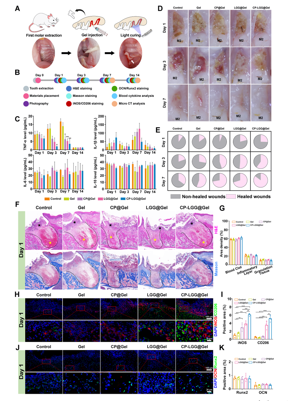 活体生物治疗水凝胶促进大鼠拔牙后窝孔愈合的疗效观察。(A)实验性大鼠拔牙模型。在双侧拔除上颌第一磨牙后,手术时将水凝胶应用于牙槽内。代表性图像显示原位注射和光聚合水凝胶(箭头)与窝解剖结构完全吻合。(B)实验过程示意图。术后第1、3、7和14天对大鼠实施安乐死,收集组织并进行分析。(C)在指定时间点测量全身细胞因子(TNFα、IL-1β、IL-6和IL-10)水平。(D)具有代表性的宏观图像,(E)伤口闭合率的量化,说明了提取部位的愈合进展。M2:第二摩尔。(F)提取孔H&E和马松三色染色组织学分析。黑色虚线表示缺陷边缘;黑星表示炎症层;黄色星形标志着血块。(G)组织形态学分析,量化愈合窝内的组织组成。(H) iNOS(红色,M1巨噬细胞标志物)和CD206(绿色,M2巨噬细胞标志物)的免疫荧光染色,DAPI(蓝色)核反染。(1)缺陷区iNOS和CD206免疫荧光阳性区定量分析。(J)成骨标志物socn(红色)、Runx2(绿色)、DAPI(蓝色)的免疫荧光染色。