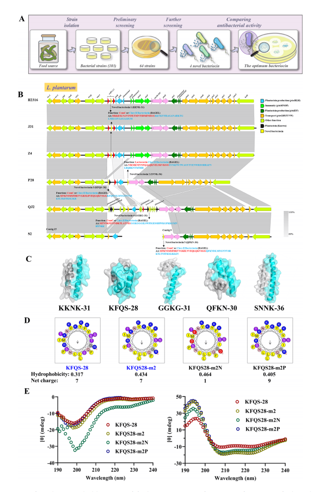 新型抗菌细菌素的发现。(A) 从发酵食品中的乳酸菌(LAB)到筛选抗菌细菌素的概念流程;(B) 通过基因组测序鉴定具有潜在抗菌活性的新型细菌素;(C) 采用AlphaFold3对五种新型细菌素进行结构预测;(D) 通过替换现有氨基酸序列生成三种具有不同疏水性和净电荷的细菌素;(E) 四种细菌素在水溶液(左)和10 mM SDS溶液(右)中的圆二色光谱分析