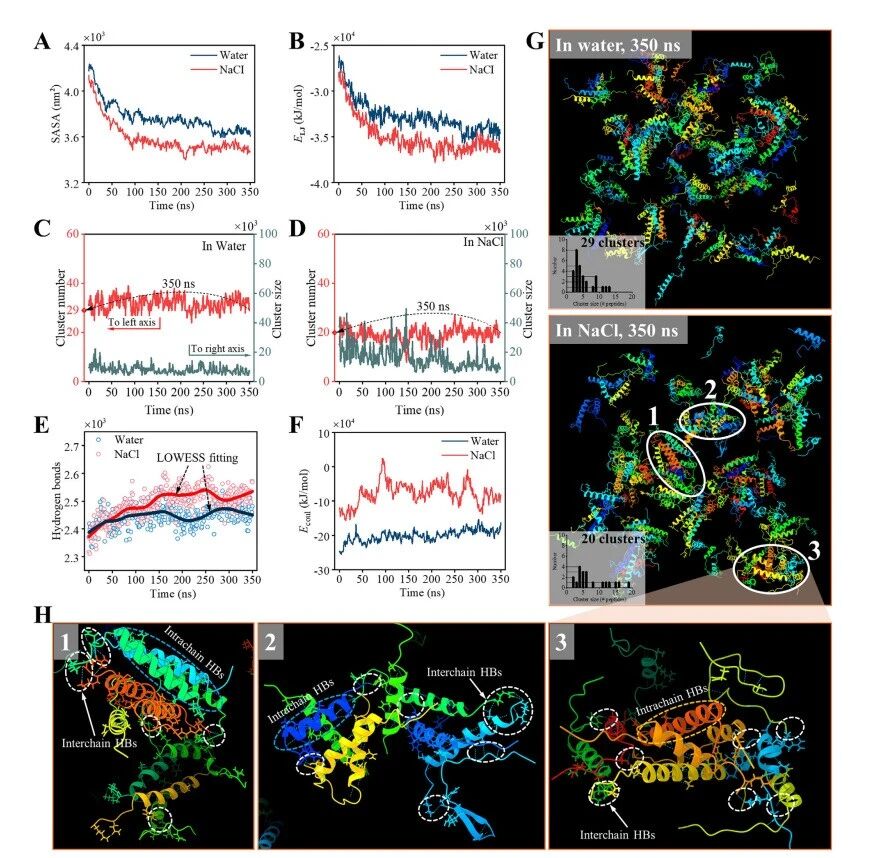 通过0-350纳秒分子动力学模拟对肽聚集的动力学、热力学及结构分析,研究对象包括水溶液和氯化钠溶液。(A) 溶剂可及表面积(SASA)演变。(B) Lennard-Jones势能(ELJ)分布。(C) 聚集簇数量及(D) 大小分布(通过每簇原子计数测量)。(E) 氢键形成动力学。(F) 库仑相互作用能(Ecoul)分布。(G) 水溶液(上图)和氯化钠溶液(下图)中350纳秒时的最终肽聚集结构,插图显示聚集体大小分布(每簇肽计数)。水溶液和氯化钠溶液分别形成29个和20个不同大小的聚集体。几乎所有肽在聚集过程中保持 α 螺旋构象。(H) 图G下图区域1-3的放大视图,突出显示关键的链间及链内氢键(虚线圆圈标示),这些氢键涉及驱动自组装的N端和C端残基。