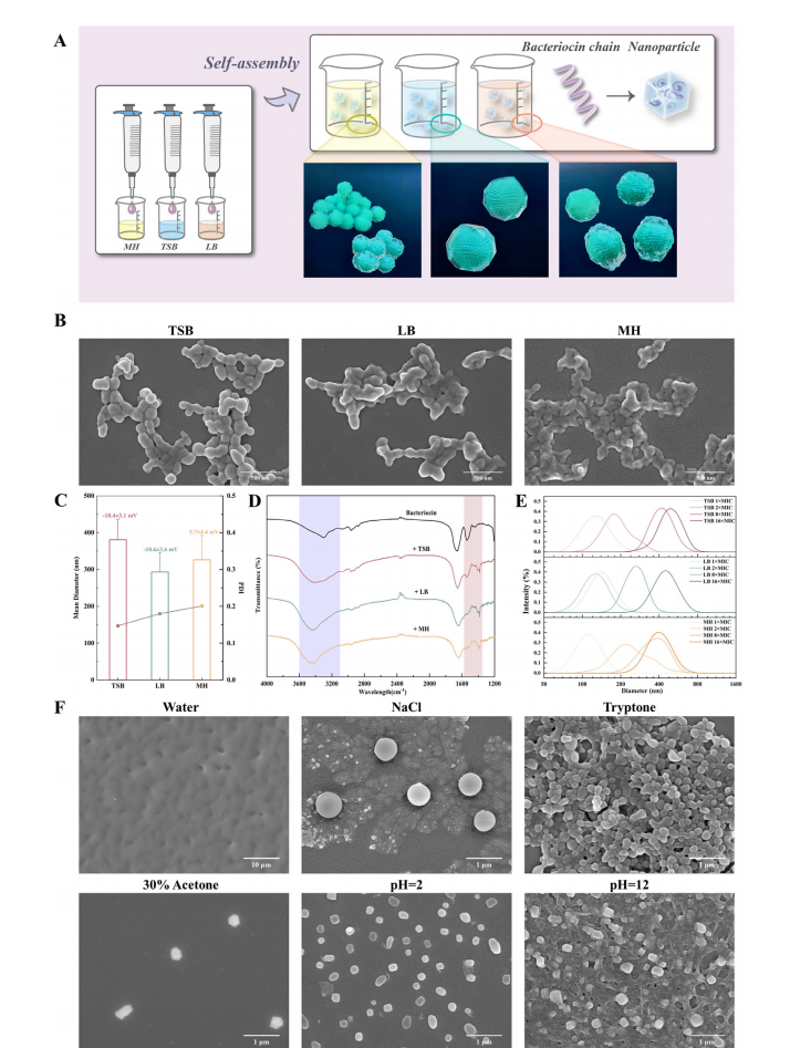 新型抗菌细菌素的自组装纳米颗粒。(A) NAMBs在TSB、LB和MH肉汤中的自组装概念;(B)不同肉汤介质中NAMBs自组装的SEM图像;(C)三种不同肉汤获得的NAMBs表征:粒径统计与zeta电位(8×MIC);(D)FT-IR透射率(8×MIC);(E)不同细菌素浓度下的粒径分布;(F)8×MIC(64 µm)浓度NAMBs在不同肉汤及体系潜在关键组分中自组装的SEM图像。