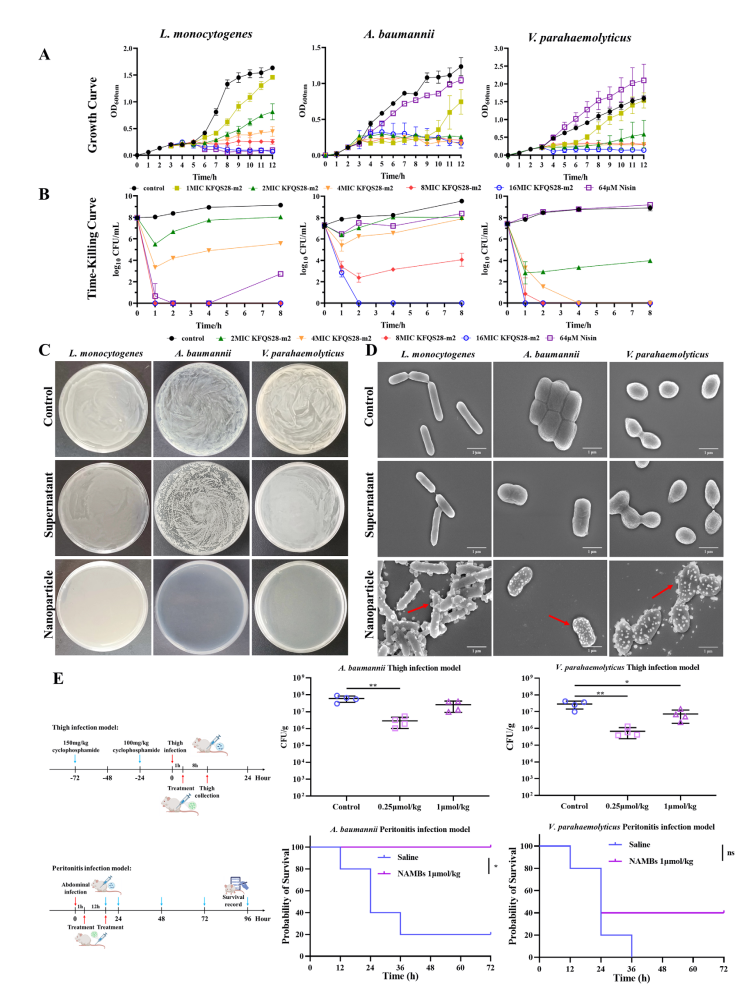 自组装抗菌细菌素纳米颗粒的抗菌活性。(A) 细菌素KFQS28-m2与乳酸链球菌素对单核细胞增生李斯特菌、鲍曼不动杆菌和副溶血性弧菌的生长曲线及(B) 杀菌时间曲线对比;(C) 离心后不同培养基中细菌素自组装产物的上清液与纳米颗粒的抗菌效果;(D) 离心后不同培养基中细菌素自组装产物的上清液与纳米颗粒对不同细菌的结合效果扫描电镜图像(红色箭头指示纳米颗粒与细胞包膜的结合);(E) 小鼠大腿感染和腹部感染模型经NAMBs处理后的对比(**p < 0.01;*p < 0.05)。