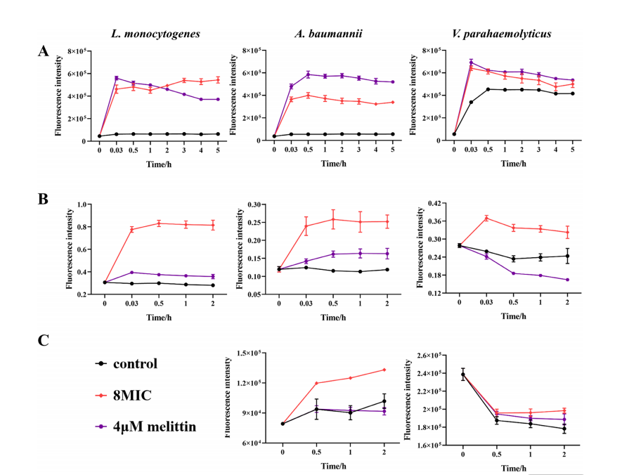 与4 µm 蜂毒肽作为阳性对照相比,经8×MIC浓度NAMBs处理后,(A)整体膜、(B)内膜及(C)外膜的通透性均发生改变。