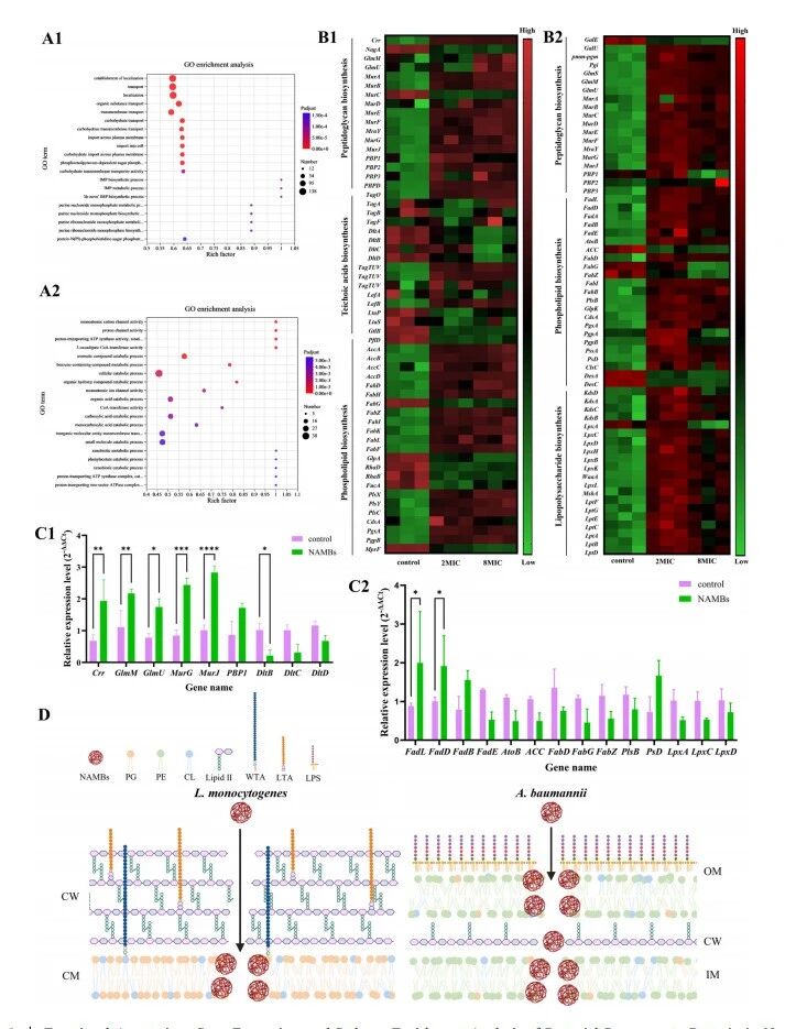 细菌对细菌素纳米颗粒处理反应的功能注释、基因表达及通路富集分析。(A) 单核细胞增生李斯特菌(A1)和鲍曼不动杆菌(A2)经8×MIC NAMBs处理后的GO富集分析;(B) 单核细胞增生李斯特菌(B1)和鲍曼不动杆菌(B2)细胞包膜组分生物合成相关基因的热图;(C) 单核细胞增生李斯特菌(C1)和鲍曼不动杆菌(C2)细胞壁基因经0.5小时8×MIC NAMBs处理后的RT-qPCR分析;(D) NAMBs对单核细胞增生李斯特菌和鲍曼不动杆菌细胞包膜的作用机制,CW-细胞壁,CM-细胞膜,IM-内膜,OM-外膜,PG-磷脂酰甘油,PE-磷脂酰乙醇胺,CL-心磷脂,WTA-壁磷壁酸,LTA-脂磷壁酸,LPS-脂多糖。