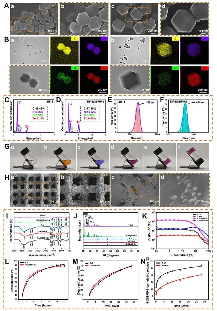本研究最核心的创新在于构建了一个时序控制释放系统。热敏胶原水凝胶作为初始快速释放载体,实现4-OI的早期释放,旨在第一时间调控植入体周围的免疫微环境;而ZIF-8则作为BMP-9的载体,提供持续、稳定的后期释放,精准匹配成骨过程的需求。