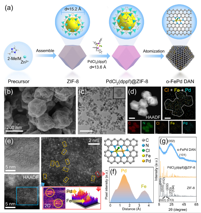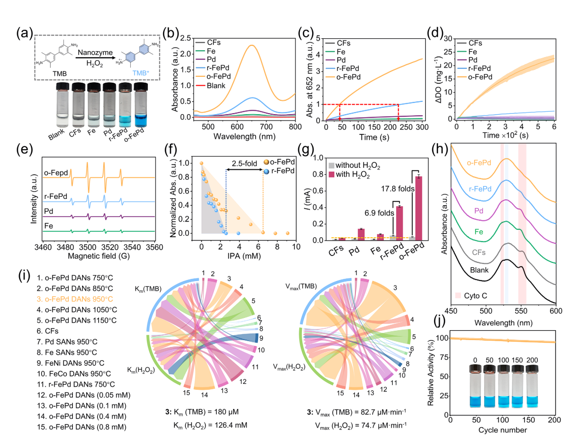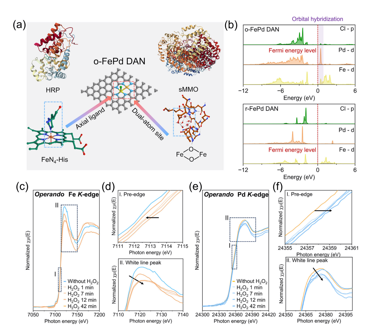 在这项研究中,团队成功设计并制备了一种空间有序的双原子纳米酶o-FePd DAN,它通过模拟天然酶的底物诱导构象锁定机制,实现了高效且动态可调的催化性能。该纳米酶以Cl-FeN₃C-PdN₃为催化中心,在双金属位点的协同作用下,不仅显著增强了对H₂O₂的吸附与活化能力,还借助氯介导的轴向配位建立了动态电子转移通路。原位X射线吸收谱分析进一步表明,在催化过程中Fe与Pd之间会形成桥连结构,促使反应机制由自由基介导的氧化向直接电子转移转变,从而有效模拟了天然双金属酶的SCL效应。