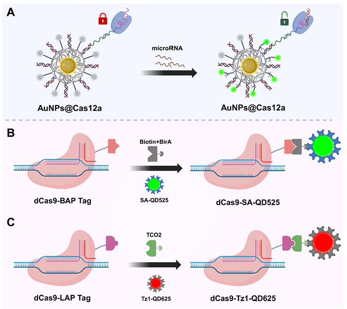 使用纳米探针进行CRISPR/Cas生物成像的示意图。(A) 用于Cas系统传递的金纳米颗粒(AuNPs)[49]。AuNPs表面可以高密度功能化修饰有二硫键的硫醇化寡核苷酸,从而实现sgRNA或荧光探针的多价锚定,同时高效淬灭荧光信号。这些特性使AuNPs能够作为Cas12a系统装载和激活的“开关”;(B) 基于LplA的量子点标记CRISPR系统(8)。在该方法中,dCas9与硫辛酸受体肽(LAP)融合,在LplA存在下与TCO2连接。随后Tz1-QD与TCO2共轭,形成用于靶DNA可视化的dCas9标记的四嗪-量子点复合物;(C) 基于生物素-链霉亲和素系统的量子点标记策略。在该方法中,dCas9与BAP标签融合,并通过生物素连接酶BirA进行生物素化。随后SA-QD与生物素化的dCas9结合,实现靶DNA的荧光标记与可视化。AuNPs:金纳米颗粒;SA-QD:链霉亲和素连接量子点;QDs:量子点;LplA:硫辛酸连接酶;BAP-tag:生物素受体肽;TCO2:反式环辛烯;Tz1-QD:四嗪修饰量子点。