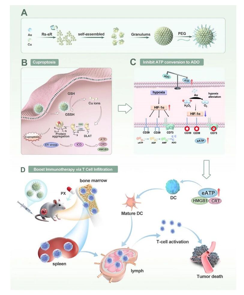 本研究提出了一种全新的“数量-质量双调控策略”,通过设计具有类酶活性的自组装Au-SS-Cu@PEG纳米簇(ACSP NCs),并结合帕罗西汀(PX),实现了对乳腺癌免疫微环境的系统性重塑与增效。该纳米簇在肿瘤微环境中可响应谷胱甘肽释放Cu²⁺,诱导铜死亡并触发免疫原性细胞死亡,释放ATP以激活树突状细胞成熟。同时,其类过氧化氢酶活性可缓解肿瘤缺氧,下调HIF-1α及CD39/CD73表达,显著减少免疫抑制性腺苷生成,使肿瘤微环境从“冷”转“热”。另一方面,PX通过干预S1P/S1PR1轴促进骨髓中T细胞释放至循环系统,增加T细胞数量,增强其向肿瘤的浸润能力。实验表明,该联合疗法在体内外均显著提升CD8⁺ T细胞比例与功能,抑制肿瘤生长,且具备良好的生物安全性。该策略通过“数量调控”增加T细胞供给,“质量调控”优化其功能与微环境,为增强实体瘤免疫治疗效果提供了具有转化潜力的新途径。