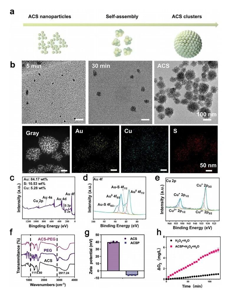 材料的合成与表征。(a) ACS纳米晶合成过程的示意图。(b) 不同时刻ACS纳米晶的TEM图像及Au、Cu和S的元素分布图。比例尺:100 nm。(c) ACS纳米晶的 XPS 结果。(d) ACS纳米晶Au 4f的高分辨率 XPS 光谱。(e) ACS纳米晶Cu 2p的高分辨率 XPS 光谱。(f) ACS纳米晶、PEG和 ACSP 纳米晶的傅里叶变换红外光谱。(g) ACS纳米晶和 ACSP 纳米晶的Zeta电位变化(n = 3),数据以均值±标准差表示。(h) 过氧化氢(5 µM)+水和过氧化氢(5 µM)+ ACSP 纳米晶(100 µg /mL)+水的 ΔO2 生成(n = 3),数据以均值±标准差表示。