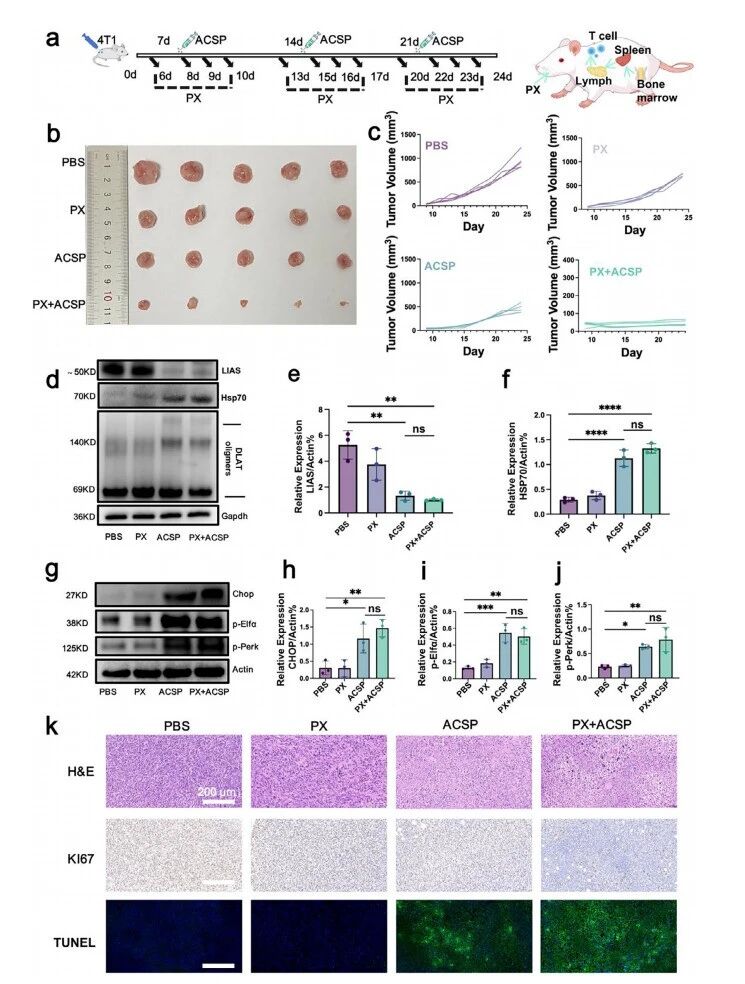 酶样 ACSP 纳米颗粒在异种移植模型中的体内抗肿瘤活性。(a)体内治疗方案示意图。(b)不同治疗组术后肿瘤组织的数字化图像。(c)治疗后小鼠肿瘤生长曲线,n=5。(d)通过蛋白质印迹法检测不同治疗组肿瘤中LIAs、Hsp70和 DLAT 的表达水平,以及(e)LIAS和(f)Hsp70蛋白的定量分析,n=3。(g)通过蛋白质印迹法检测不同治疗组肿瘤中p-Perk、p- Elf2α 和Chop蛋白的表达水平,并对(h)Chop、(i)p- Elf2α 和(j)p-Perk蛋白进行定量分析,n=3。(k)治疗后肿瘤的代表性病理染色结果(H&E染色、 TUNEL 和Ki67)。数据以均值±标准差表示。(e、f、h–j)组的统计学显著性采用单因素方差分析结合Tukey事后检验计算。*p<0.05,**p<0.005,***p<0.001,****p<0.0001,ns表示无统计学意义。