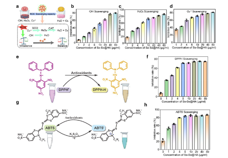 Se−Se@HA的ROS清除活性。(a) ROS清除机制示意图,其中Se−Se@HA通过催化消除•OH、过氧化氢和O2•−以恢复氧化平衡。(b−d) Se−Se@HA对•OH(b)、过氧化氢(c)和O2•−(d)的浓度依赖性清除效率。(e) 评估抗氧化能力的 DPPH •还原实验示意图。(f) Se−Se@HA在不同浓度下的 DPPH •自由基清除效率。(g) ABTS •+还原实验示意图。(h) Se−Se@HA在不同浓度下的 ABTS •+清除效率。数据以均值±标准差表示(n = 3)。
