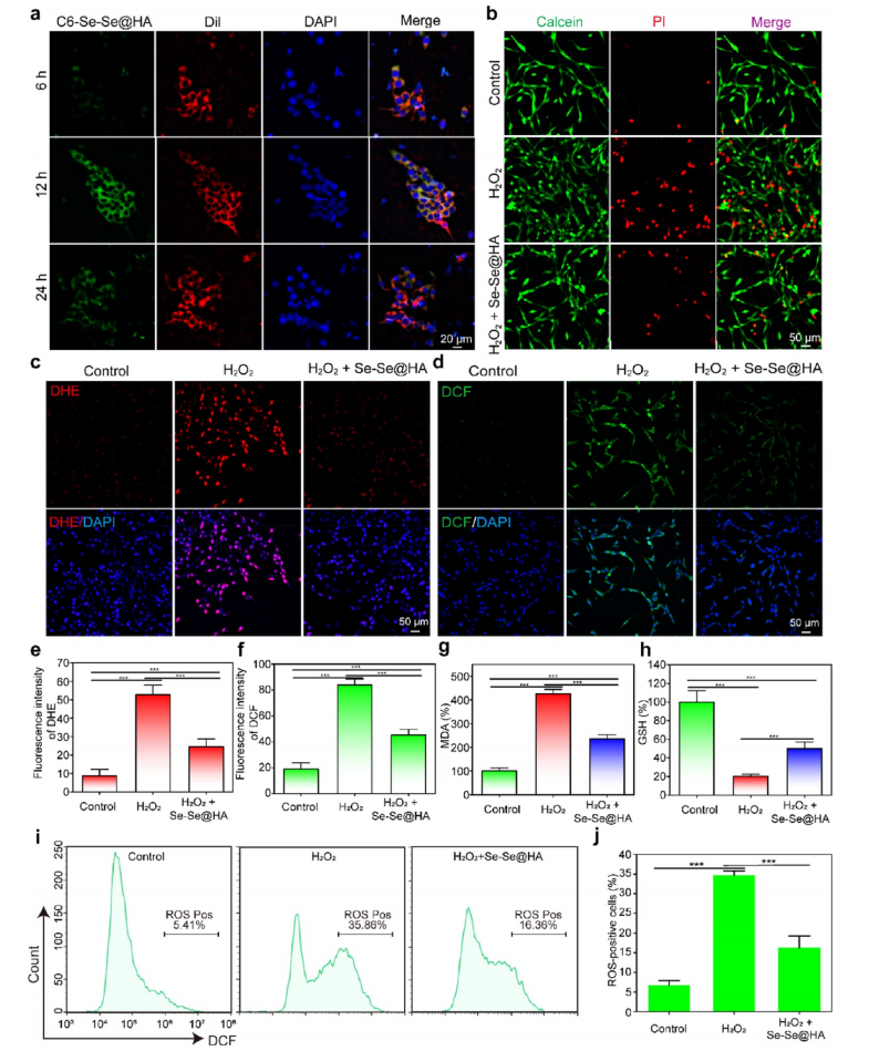 Se−Se@HA的细胞内活性氧清除能力。(a) 共聚焦激光扫描显微镜(CLSM)图像显示C6标记的Se−Se@HA在6、12和24小时的细胞摄取情况。比例尺:20 μm 。(b) Calcein-AM/PI染色显示经H2O2损伤的细胞在Se−Se@HA处理或未处理情况下的细胞活力(绿色:活细胞,红色:死细胞)。比例尺:50 μm 。(c) DHE 染色和(d) DCFH -DA染色表明对照组、过氧化氢组和过氧化氢+Se−Se@HA组的细胞内超氧化物和总活性氧水平。比例尺:50 μm 。(e,f) DHE (e) 和 DCF (f) 信号的定量荧光强度分析。(g,h) 细胞内MDA (g) 和 GSH (h) 水平,显示治疗后氧化应激减轻。(i,j) 流式细胞术分析 (i) 和活性氧阳性细胞的定量 (j),证实Se−Se@HA有效抑制活性氧。数据以均值±标准差表示(n = 3),***p < 0.001。