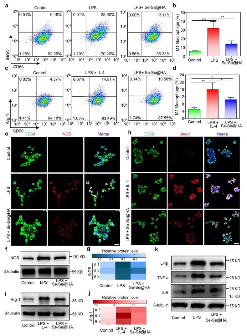 Se−Se@HA通过调节巨噬细胞极化发挥抗炎作用。(a)代表性流式细胞术图显示对照组、LPS刺激组及LPS+Se−Se@HA处理组中M1型巨噬细胞(iNOS+ CD68+)的比例。(b)M1型巨噬细胞百分比定量分析表明,Se−Se@HA显著降低LPS诱导的M1型极化。
