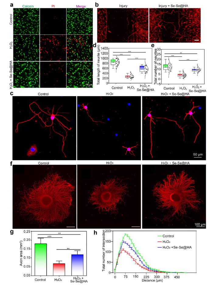 Se−Se@HA的体外神经保护作用。(a) 经过过氧化氢或过氧化氢+Se−Se@HA处理的海马神经元活/死染色代表性图像,显示Se−Se@HA处理后细胞活力增强(钙黄绿素AM,绿色)且细胞死亡减少(PI,红色)。比例尺:50 μm 。(b) Se−Se@HA处理前后损伤皮层神经元中 βIII 微管蛋白的代表性免疫荧光染色,表明神经突网络完整性改善。比例尺:200 μm 。(c) 不同处理下原代海马神经元的 βIII 微管蛋白免疫荧光代表性图像,显示Se−Se@HA干预后轴突形态和分支的保存。比例尺:50 μm 。(d,e) 海马神经元总神经突长度(d)和分支数量(e)的定量分析,揭示与单独使用过氧化氢相比,Se−Se@HA有显著改善。(f) 不同处理下 DRG 外植体的 βIII 微管蛋白代表性免疫染色,显示Se−Se@HA处理后轴突生长增强。比例尺:100 μm 。(g) DRG 外植体中轴突生长区域的量化,证明Se−Se@HA具有显著的挽救效应。(h) DRG 轴突交叉点的Sholl分析随距胞体距离的变化,表明与过氧化氢处理相比,Se−Se@HA能促进更长、更密集的轴突投射。