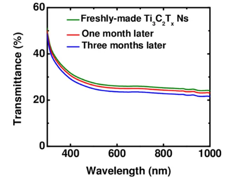 Figure 2 Transmittance of Ti3C2Tx MXene nanosheet dispersions when freshly prepared and stored for 1 month and 3 months.