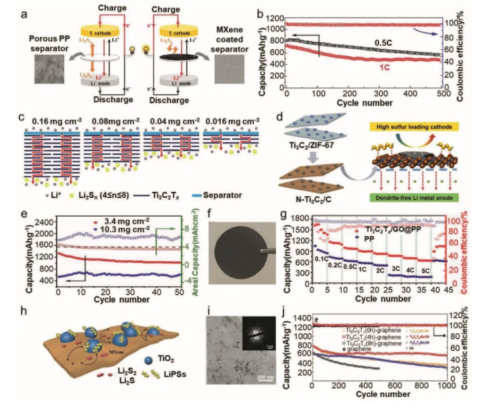 Two-dimensional transition metal carbide/nitride (MXenes) is a new type of two-dimensional material, usually prepared by selective etching of the "A" layer in the stacked MAX phase (Mn+1AXn, n=1–4), where "M" represents early transition metals, such as Ti, V, Zr, and Nb, "A" represents IIIA or IVA elements (such as Al, Ga, Si, etc.), and "X" corresponds to carbon and/or nitrogen. At present, MXenes has shown very promising applications in realizing high-performance Li-S batteries. The metal conductivity of MXenes provides rapid electron transfer to promote full utilization of sulfur, thereby ensuring the high capacity of Li-S batteries. The terminal on the surface of MXenes can form a strong metal-S bond, which exhibits a strong adsorption effect on LiPSs, thereby inhibiting the shuttle effect. MXenes with abundant ends can effectively catalyze the conversion between LiPSs and Li2S, thereby promoting the redox kinetics during the cycle. MXenes can also induce uniform nucleation and growth of lithium to inhibit lithium dendrites. The structural diversity of MXenes provides huge opportunities for loading large amounts of sulfur or lithium and adapting to volume expansion. Therefore, MXenes has an attractive prospect in the improvement of Li-S battery performance.