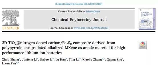Recently, Professor Pan Likun of East China Normal University published in the internationally renowned academic journal Chemical Engineering Journal the title: 3D TiO 2 @ nitrogen-doped carbon / Fe 7 S 8composite derived from polypyrrole-encapsulated alkalized MXene as anode material for high performance lithium-ion Research papers forbatteries . In this study, a precursor was first prepared by in situ polymerization of a pyrrole monomer on a basicized Ti 3 C 2 T x , and a composite material was obtained by vulcanization at a high temperature of 700 ¡ã C. The lithium composite electrode is applied, in A G 0.1 -1 having a high current density of 516 mAh g of -1 reversible capacity, while the G. 4A -1high electrical lower current density after 1000 charge-discharge cycles, Can retain 282 mAh g -1 reversible capacity. This outstanding performance can be attributed to the unique 3D sea urchin-like TiO 2 with good structural stabilityIt can provide enough space to promote the contact between the electrode and the electrolyte, shorten the lithium ion diffusion path and limit the volume expansion. N-doped carbon can improve conductivity, promote electron transfer, and prevent the accumulation of Fe 7 S 8 .