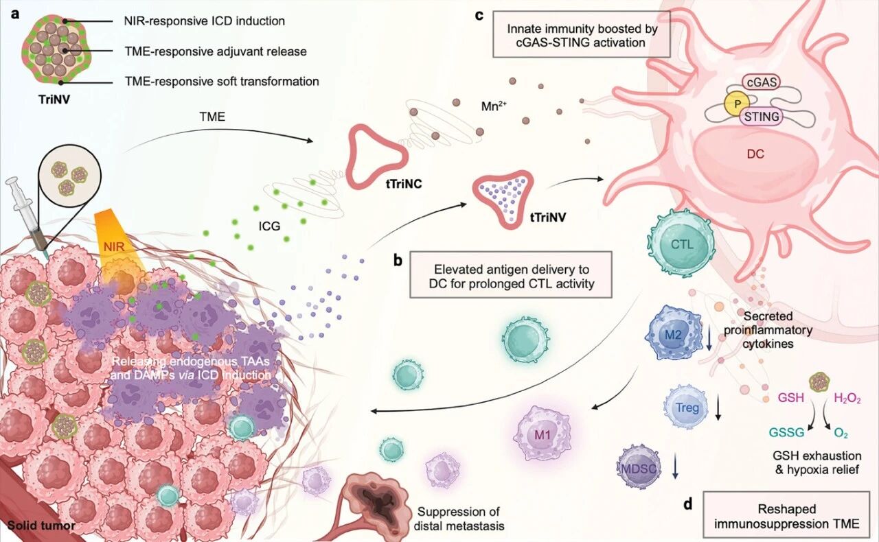 In situ tumor vaccines (ISTVs) have great potential in tumor immunotherapy, but three major obstacles still need to be overcome, including insufficient endogenous antigen uptake by dendritic cells (DCs), weak T cell immune responses, and the persistence of a stubbornly immunosuppressive tumor microenvironment (TME).Here, a triple nanovaccine (TriNV) with TME-responsive convertible capability was developed to triple enhance anti-tumor immunity. First, after inducing immunogenic cell death via TriNV-based phot immunotherapy, sufficient endogenous tumor-associated antigens (TAAs) are released in situ. In the TME, the soft-convertible TriNV enhances DC uptake of TAAs, thereby boosting adaptive immunity.Secondly, self-regulated TriNV and Mn²⁺ released in response to TME synergistically promote DC maturation and macrophage M1 polarization by enhancing stimuli that activate interferon genes, thereby further amplifying T cell immune responses.In addition, the decomposition of MnO₂ at the core of TriNV depletes glutathione and promotes the release of O₂ to alleviate hypoxia in the TME, thereby overcoming the chemical barriers of the TME and further reducing immunosuppression. As a result, TriNV significantly eradicates primary tumors and inhibits distant metastasis, demonstrating the great potential of this ISTV nanoplatform as a feasible and effective approach to combat poorly immunogenic solid tumors.