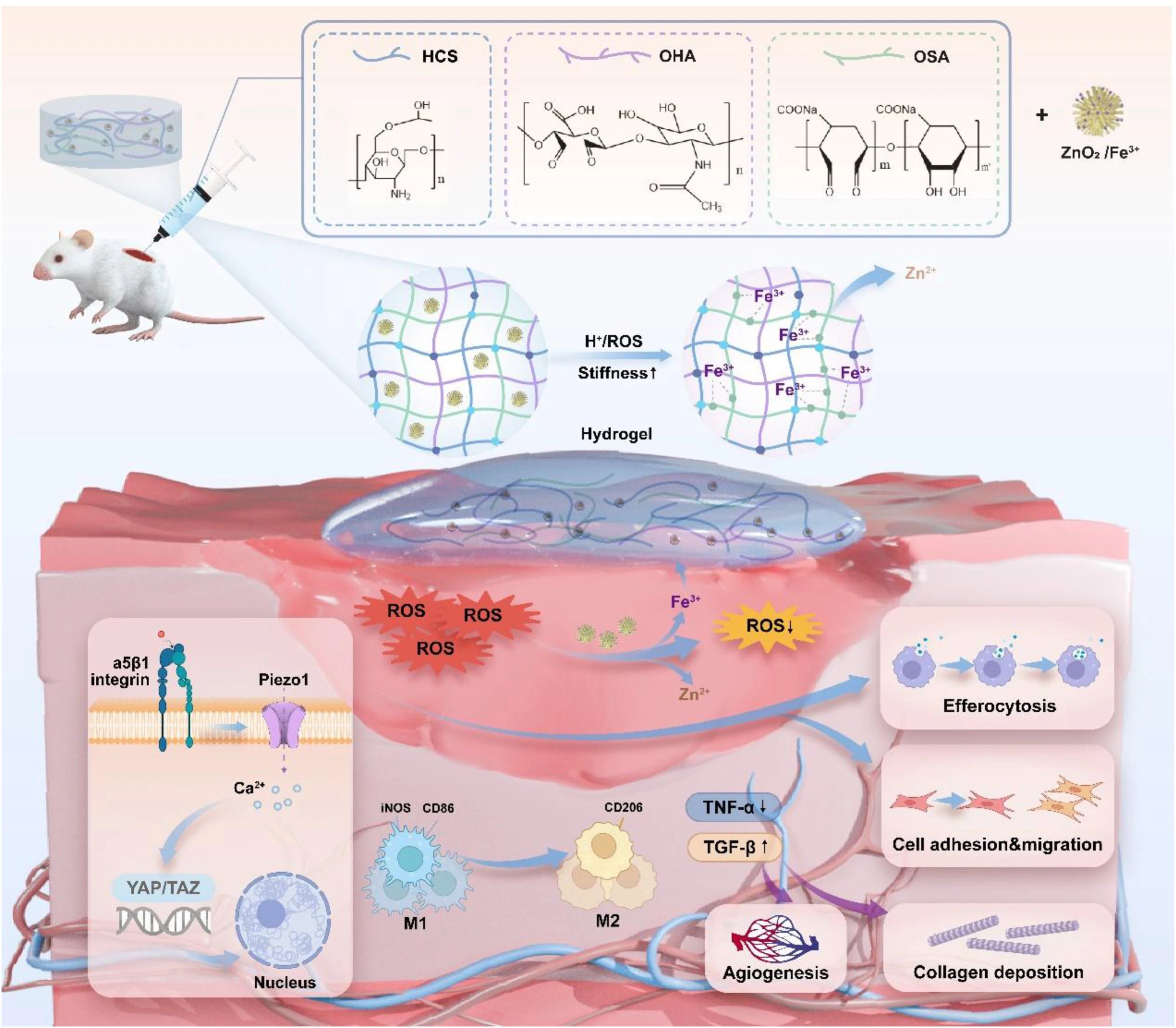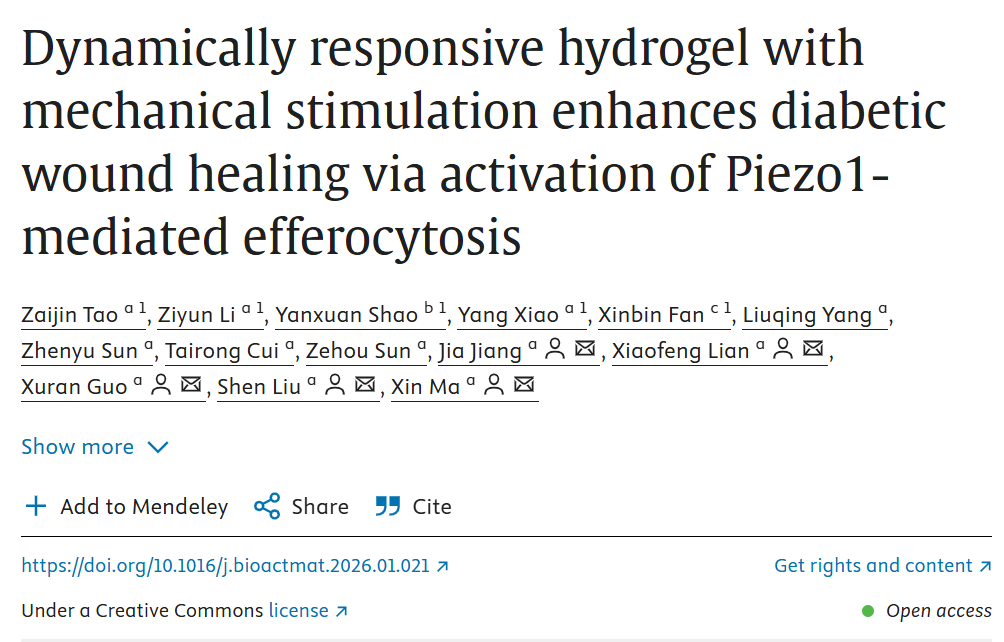 This study investigates how to use a novel dynamically responsive hydrogel to synergistically regulate the wound microenvironment and apply biophysical stimulation, thereby efficiently promoting the healing of chronic diabetic wounds. The research innovatively developed a hydrogel dressing with a dynamic network and tunable mechanical properties, which, through its reactive oxygen species-responsive characteristics and PIEZO1-mediated cellular mechanotransduction mechanism, enables precise intervention in multiple repair processes, including inflammation, oxidative stress, and angiogenesis. The related research findings were published under the title "Dynamically Responsive Hydrogel Combined with Mechanical Stimulation Promotes Diabetic Wound Healing via PIEZO1-Mediated Erythrocyte Mechanotransduction" in the well-known biomaterials journal Bioactive Materials.