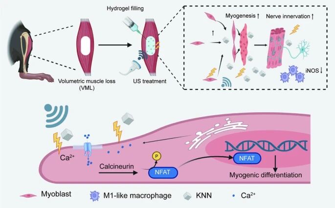 This study investigated novel therapeutic strategies for volumetric muscle loss (VML) and designed an injectable, conductive hydrogel with piezoelectric properties called KOCC hydrogel. Lead-free piezoelectric (K, Na)NbO₃ (KNN) nanoparticles were incorporated into a dynamically crosslinked network composed of oxidized sodium alginate, quaternary ammonium chitosan, and calcium ions, combined with ultrasound stimulation to establish a wireless electrotherapy strategy. This approach does not require implanted electrodes or external wires, can generate controllable local electric fields, and promotes functional improvement in a mouse VML model by coordinating myogenesis, enhancing nerve regeneration, and neuromuscular junction formation, while reducing excessive inflammation and fibrosis. This work provides a novel piezoelectric platform for VML treatment; related literature was published in the Journal of Nanobiotechnology.